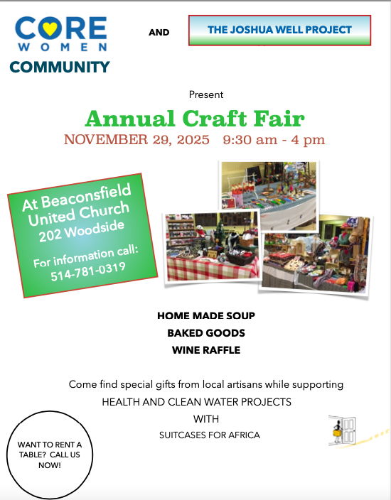 Annual Craft Fair (Hosted by Core Women & Joshua Well Project) November 29, 2025 Beaconsfield United Church202 Woodside Rd, Beaconsfield, QC , Quebec H9W 2P1View LocationMap Beaconsfield United Church iCal Google Calendar View full calendar